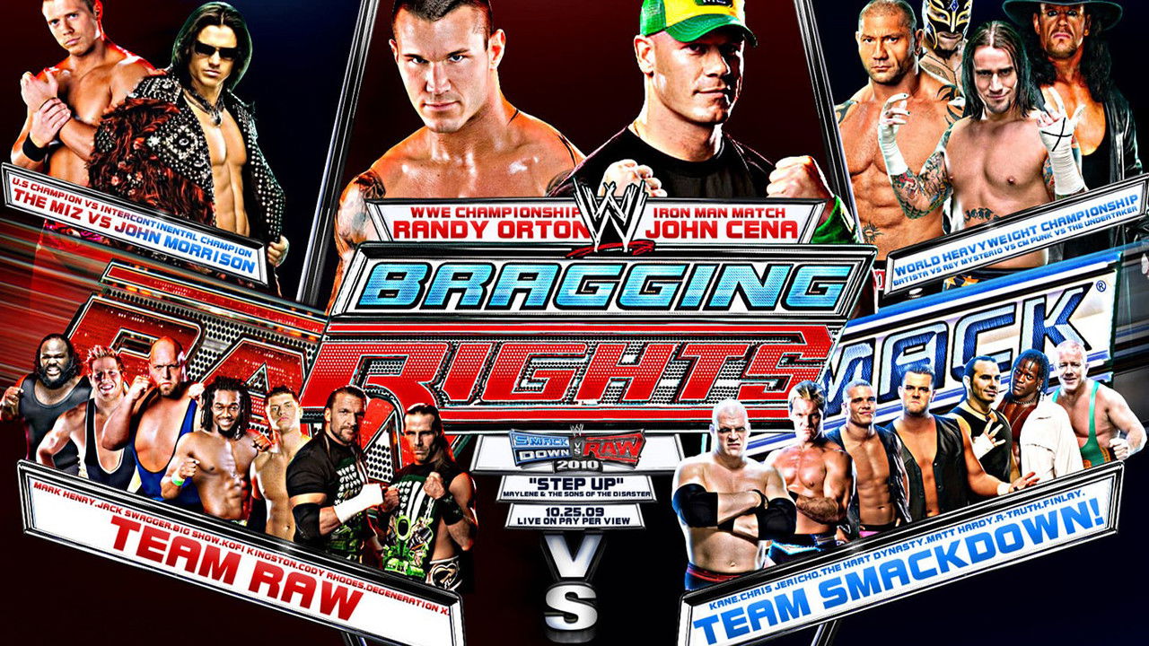 Description: Bragging Rights (2009) was a PPV presented by THQ's WWE Smackdown vs Raw 2010. It took place on October 25, 2009 at the Mellon Arena in Pittsburgh, Pennsylvania. It was the first Bragging Rights event. A Bragging Rights trophy was awarded to the show that won the most matches. Matches included Raw's US Champion The Miz versus SmackDown's IC Champion John Morrison, SmackDown's team of Michelle, Beth and Natalya versus Raw's team of Melina, Kelly and Gail, and Raw's team of Triple H, Shawn Michaels, Big Show, Cody Rhodes, Jack Swagger, Kofi Kingston and Mark Henry versus SmackDown's team of Jericho, Kane, R-Truth, Matt Hardy, Finlay, Tyson Kidd and David Hart Smith. The show also contained three world championship matches including the main event where Randy Orton defended against John Cena in an Anything Goes Iron Man match for the WWE Championship, and The Undertaker defended against CM Punk, Rey Mysterio and Batista in a Fatal Four-Way match for the World Heavyweight Championship.